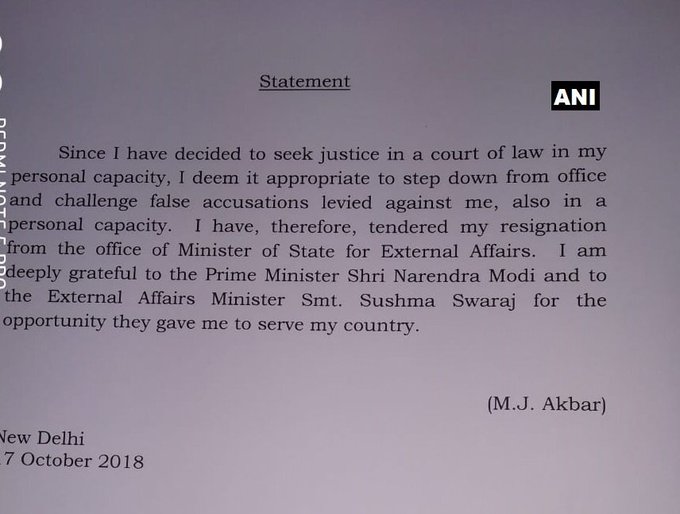 இந்நிலையில், அமைச்சர் எம்.ஜே.அக்பர் தனது பதவியை இன்று ராஜினமா செய்துள்ளார்.